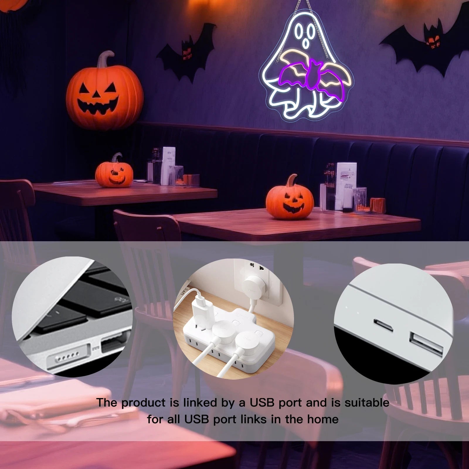 Halloween Ghost Neon Sign - LED Spooky Bat Light - Pub Home Happy Play Area Maze