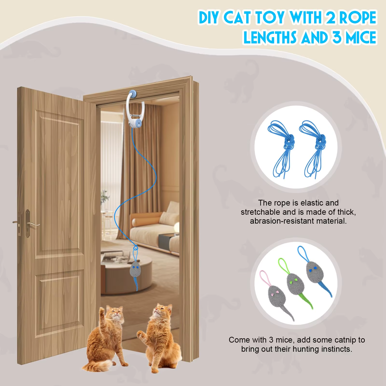 Made with high-quality materials and built to last, our automatic hanging cat toy is the perfect way to entertain your fury friends when you are not home! Soft Plush mice will hang from your door frame and rebound automatically, enticing your cats into hours of play, mimicking hunting and giving your cats plenty of exercise!