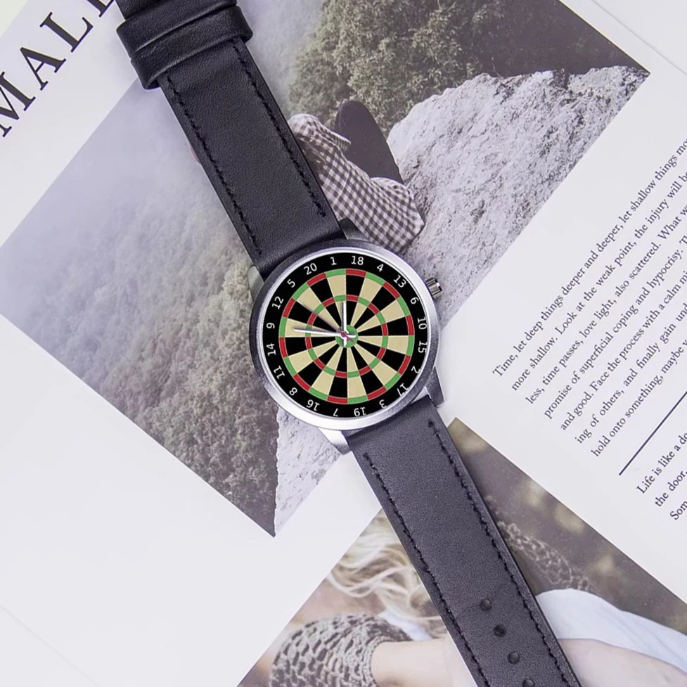 This one-off design darts watch is a testament to understated elegance and practicality. With its sleek alloy case and Leather strap, this timepiece embodies a fusion of sporty and business-ready aesthetics. The Unique Dartboard design will make any fan of Darts happy, and makes an excellent gift for the enthusiast. The quartz movement ensures precise timekeeping, while the water resistance depth of 3Bar allows for splashes and brief immersions without concern. The dual display feature adds a modern touch, enabling quick glances at the day and date.