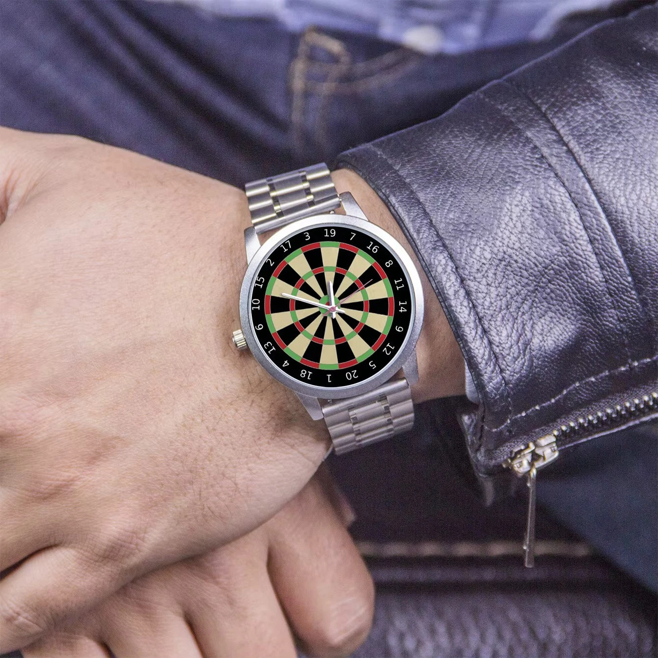 This one-off design darts watch is a testament to understated elegance and practicality. With its sleek alloy case and Stainless strap, this timepiece embodies a fusion of sporty and business-ready aesthetics. The Unique Dartboard design will make any fan of Darts happy, and makes an excellent gift for the enthusiast. The quartz movement ensures precise timekeeping, while the water resistance depth of 3Bar allows for splashes and brief immersions without concern.