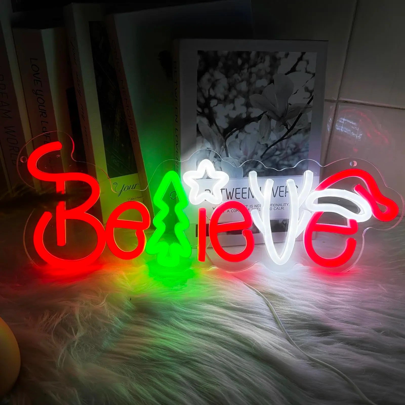 Merry Christmas Neon Sign - LED Believe Light - Happy Xmas Tree Santa Hat Store